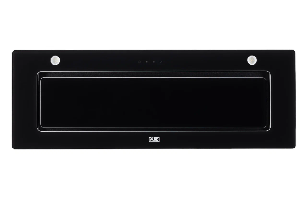 Полностью встраиваемая вытяжка с периметрическим всасыванием, ширина 80см, дизайн - чёрное стекло, сенсорное управление, воздушный поток 1000м3/час.