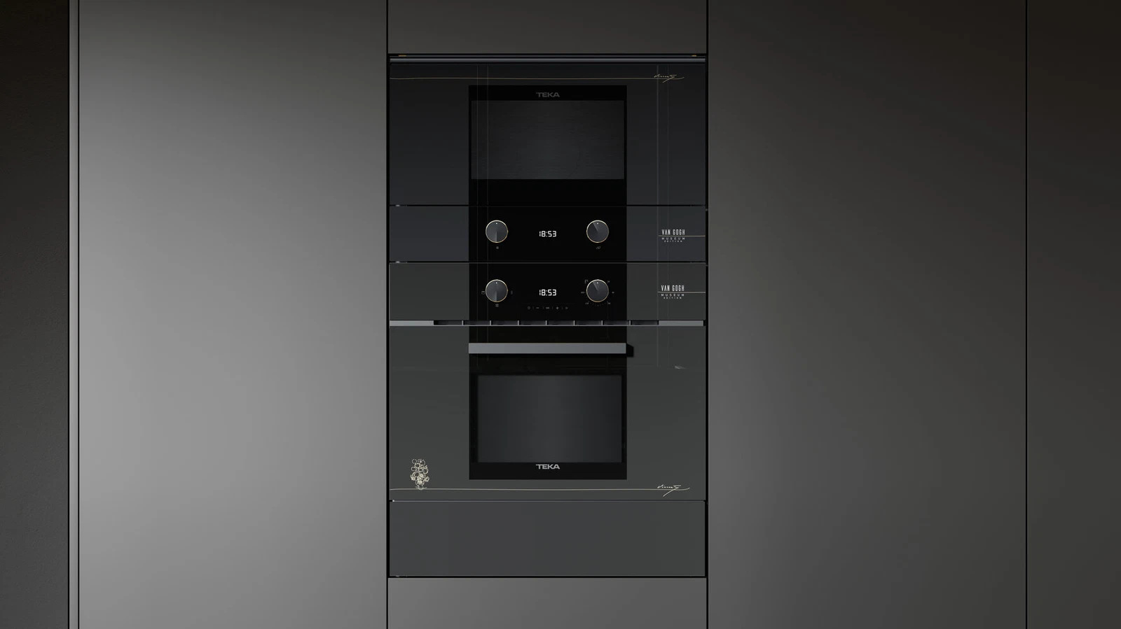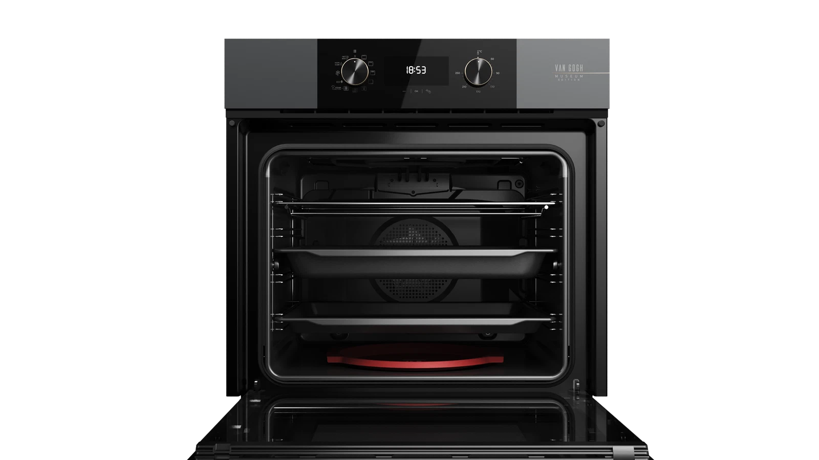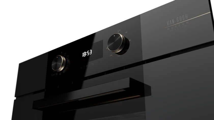 Этот мультифункциональный духовой шкаф сочетает в себе инновационные технологии и изысканный дизайн из специальной коллекции Van Gogh, созданной в сотрудничестве с музеем Ван Гога в Амстердаме. На фасаде из чёрного и тёмно-серого стекла без рамки красуется шелкография с подписью художника и эскизом подсолнухов в цвете шампань с искрой, а фиксированные регуляторы и ручка выполнены в комбинации металлов оттенков шампань и сверкающий чёрный.