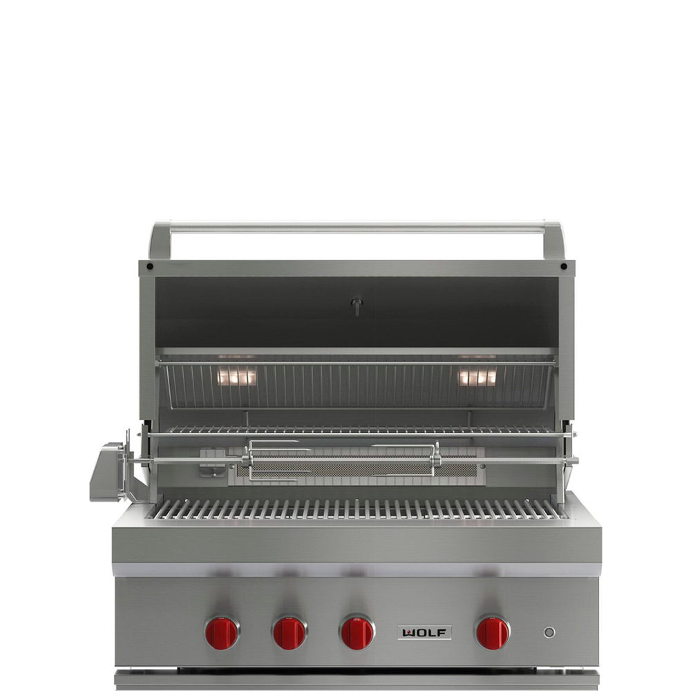 Подобно аналогичным грилям для использования дома газовые грили Wolf для использования вне помещения сохраняют те же характеристики элементов, изготовленных из высокопрочной стали. Данный гриль шириной 914 мм имеет мощные конфорки через каждые 127 мм