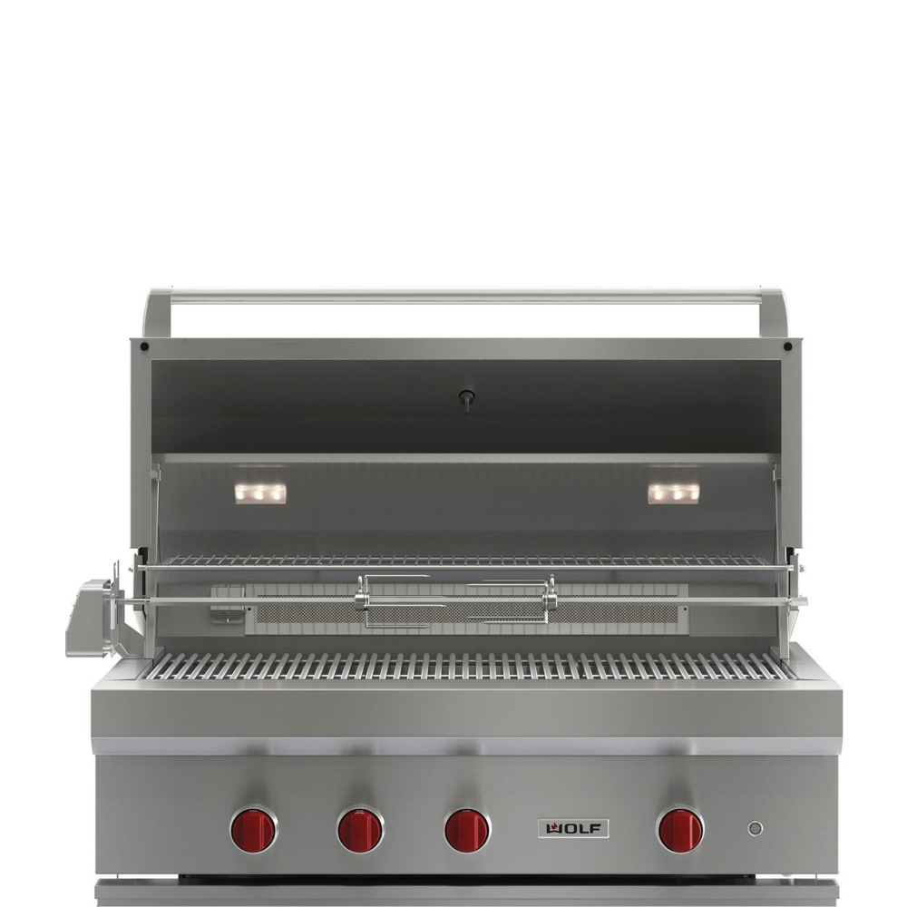 для равномерного распределения тепловой энергии. Электрический вертел с инфракрасным элементом позволяет готовить сочную птицу или жаркое. Газовый гриль Wolf может быть встроенным или перемещаться на специальной тележке. Функционирует на природном газе или газе пропане.