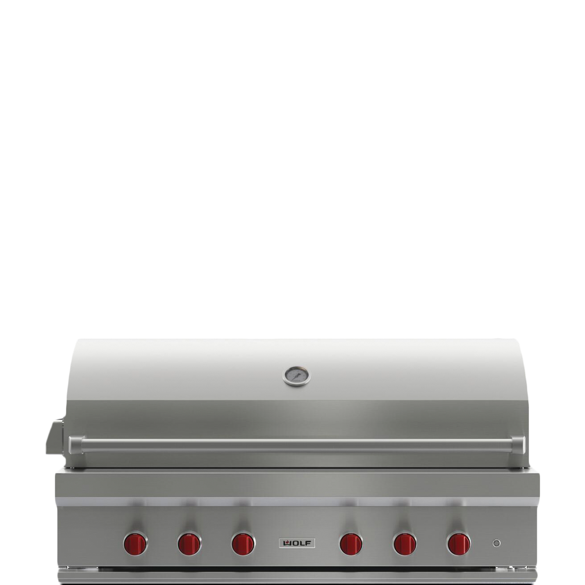 для равномерного распределения тепловой энергии. Электрический вертел с инфракрасным элементом позволяет готовить сочную птицу или жаркое. Газовый гриль Wolf шириной 1372 мм доступен только для встраивания в мебель. Функционирует на природном газе или газе пропане.