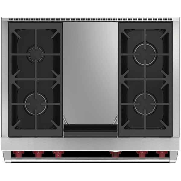 Газовая варочная поверхность состоит из четырёх горелок, мощностью от 2,7 кВ (для топления) до 5,3 кВ (для быстрого закипания и интенсивной обжарки) . Запатентованная двухуровневая конструкция газовой горелки Wolf позволяет максимально точно контролировать температуру нагрева. Система искрового реподжига автоматически зажигает горелку при её заливе. Увеличенная площадь теппана обеспечивает равномерное распределение тепла, позволяя быстро приготовить сразу несколько блюд для большой семьи или гостей.