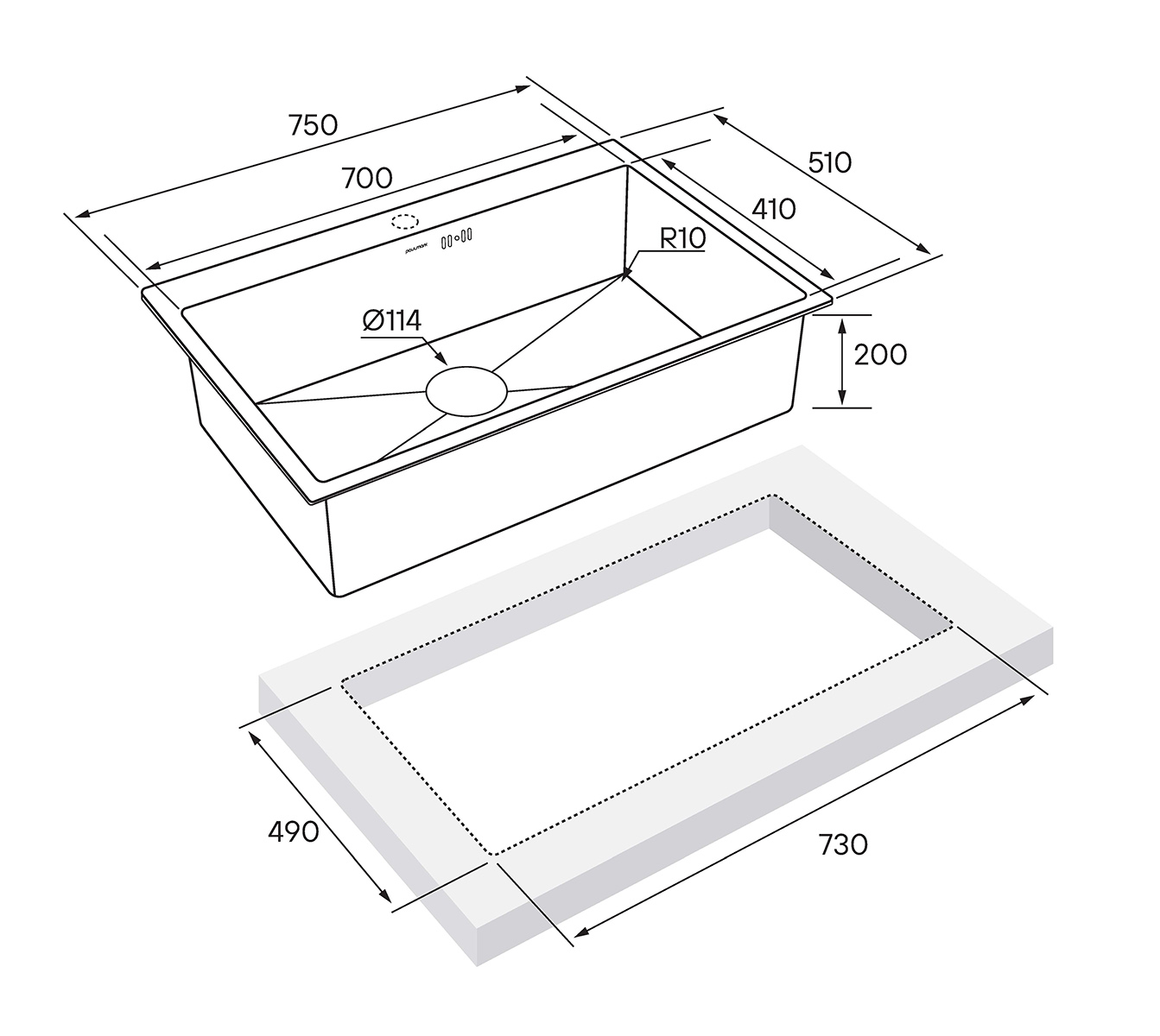 Габариты мойки составляют 750х510 мм, вместительная чаша обеспечивает максимальное пространство для мытья посуды. Возможен монтаж вровень со столешницей или врезной монтаж мойки.