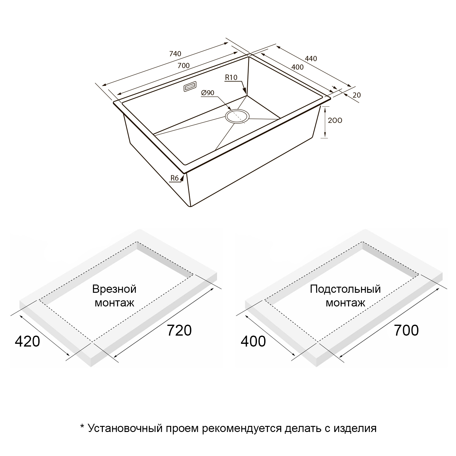 - Комплект крепежей для подстольного монтажа; - Комплект для врезного монтажа; - Отводная арматура (слив-перелив); - Декоративная накладная на сливное отверстие; - Сифон бутылочного типа с подключением посудомоечной машины (ПММ).