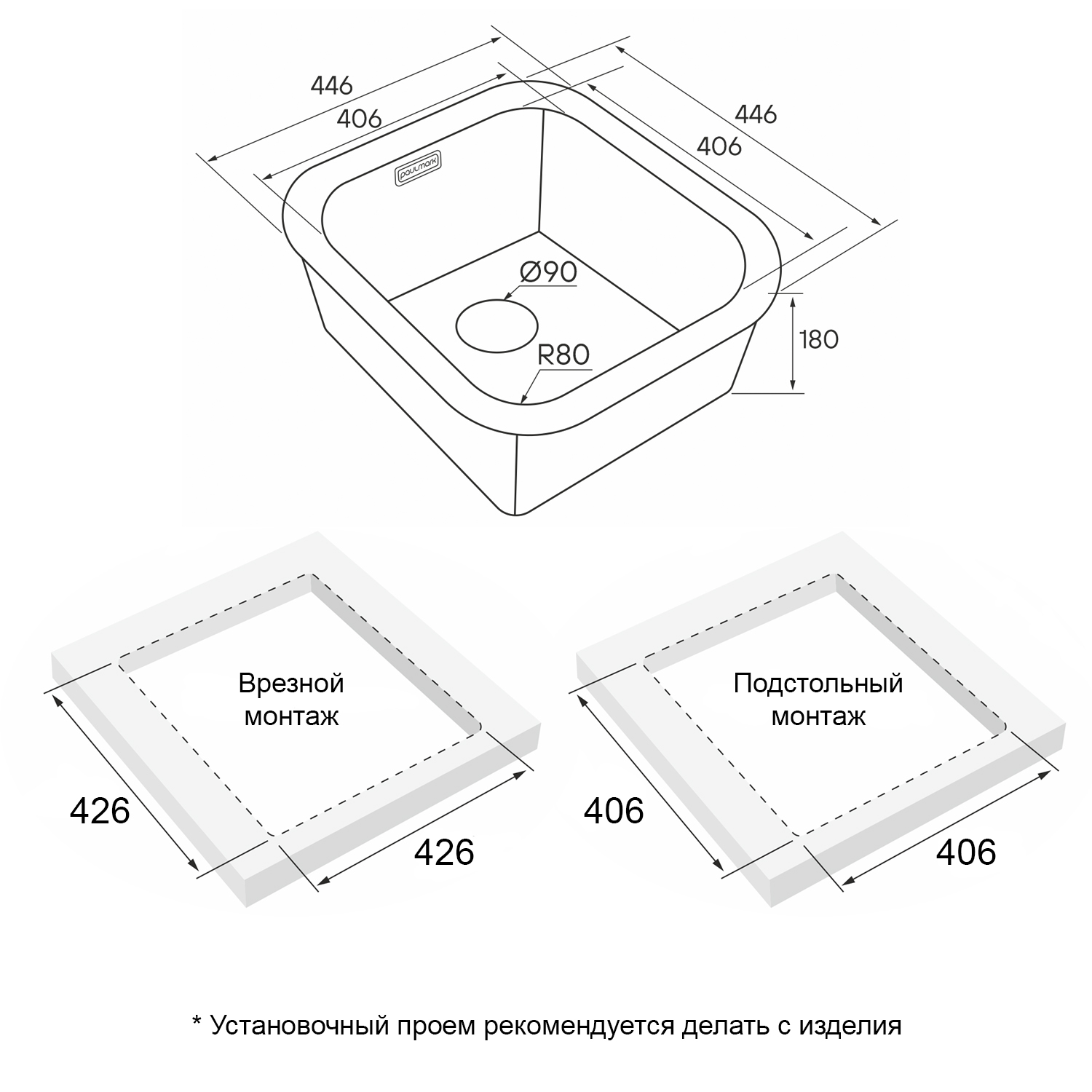 Мойки VELLO UNI могут быть установлены как врезным способом поверх столешницы, так и под столешницу (подстольный монтаж).
