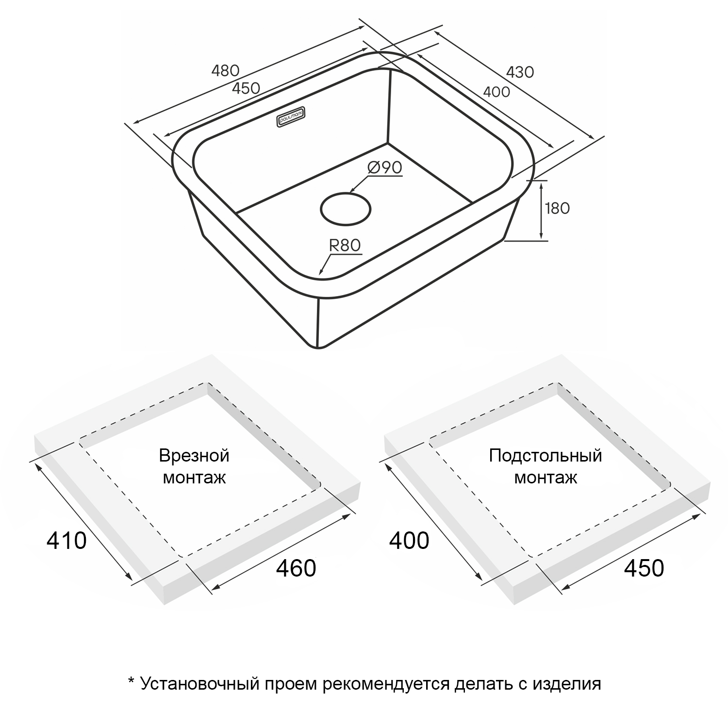 Мойки VELLO UNI могут быть установлены как врезным способом поверх столешницы, так и под столешницу (подстольный монтаж).