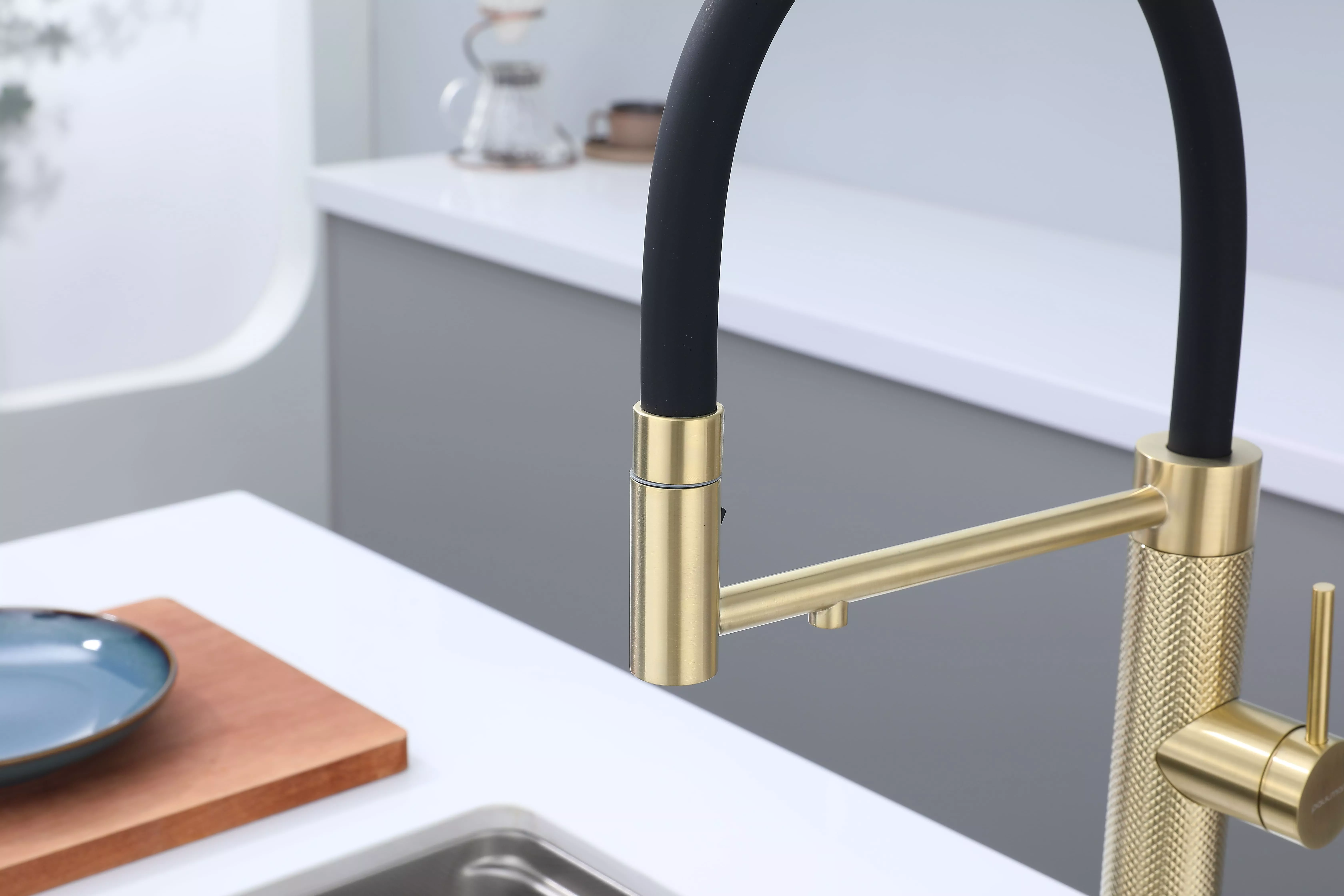 Смеситель для кухни GANYMEDE DIAMOND сочетает в себе стильный дизайн и передовые технологии. Благодаря функции подключения фильтра питьевой воды и специальной технологии Trinkwasser® водопроводная и очищенная вода никогда не смешиваются, а управление ими осуществляется единым удобным рычагом 2в1. Гибкий силиконовый излив обеспечивает широкий диапазон движений и надежно фиксируется элементом корпуса в форме кольца. На конце излива расположена кнопка для переключения между режимами струи и душа, что идеально подходит для мытья посуды и продуктов. Декоративные насечки на корпусе создают игру света и делают модель эксклюзивной. Излив поворачивается на 360°, а расширенная гарантия производителя составляет 8 лет.
