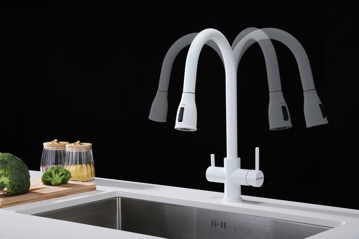 Смеситель LANGE оснащен функциями подключения фильтра питьевой воды, выдвижения излива и двумя режимами подачи водопроводной воды: струя и душ.
