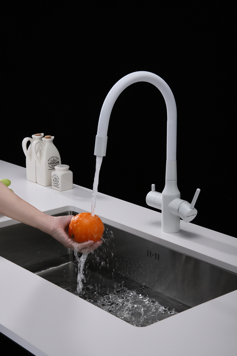 Смеситель для кухни SALIX c возможностью подключения системы фильтрации питьевой воды изготовлен из высококачественной латуни, которая отвечает высочайшим европейским стандартам качества, не содержит свинца, не разрушается со временем и безопасна для здоровья.