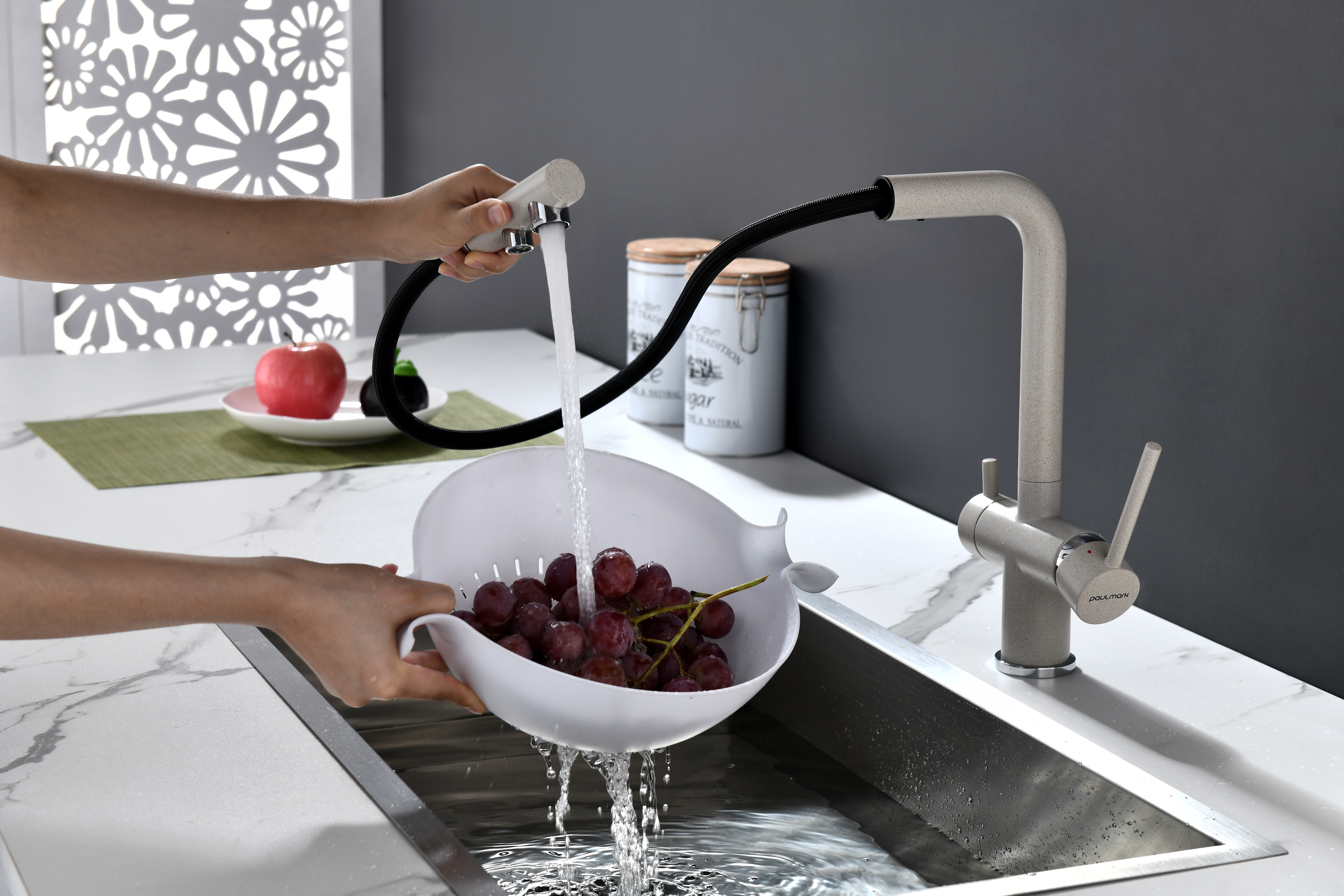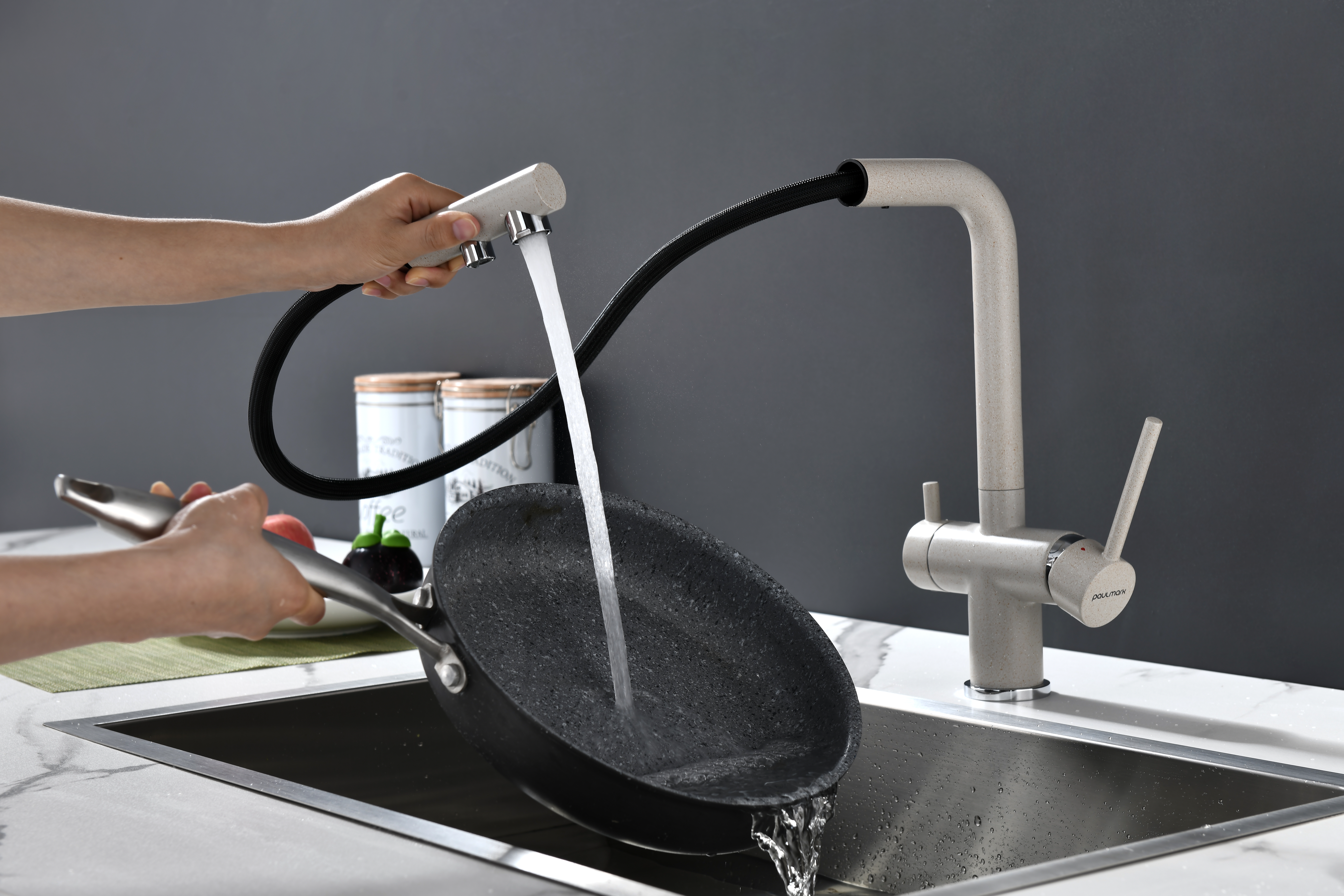 Смеситель оснащен гибким выдвижным изливом из нейлоновой оплетки, которая обладает отличной устойчивостью к истиранию и разрушению. Данная техническая особенность расширяет рабочую зону смесителя, позволяя пользоваться им с удобством в больших мойках, мойках с двумя чашами, или наполнять водой ёмкость на столе рядом с мойкой, в том числе питьевой водой.