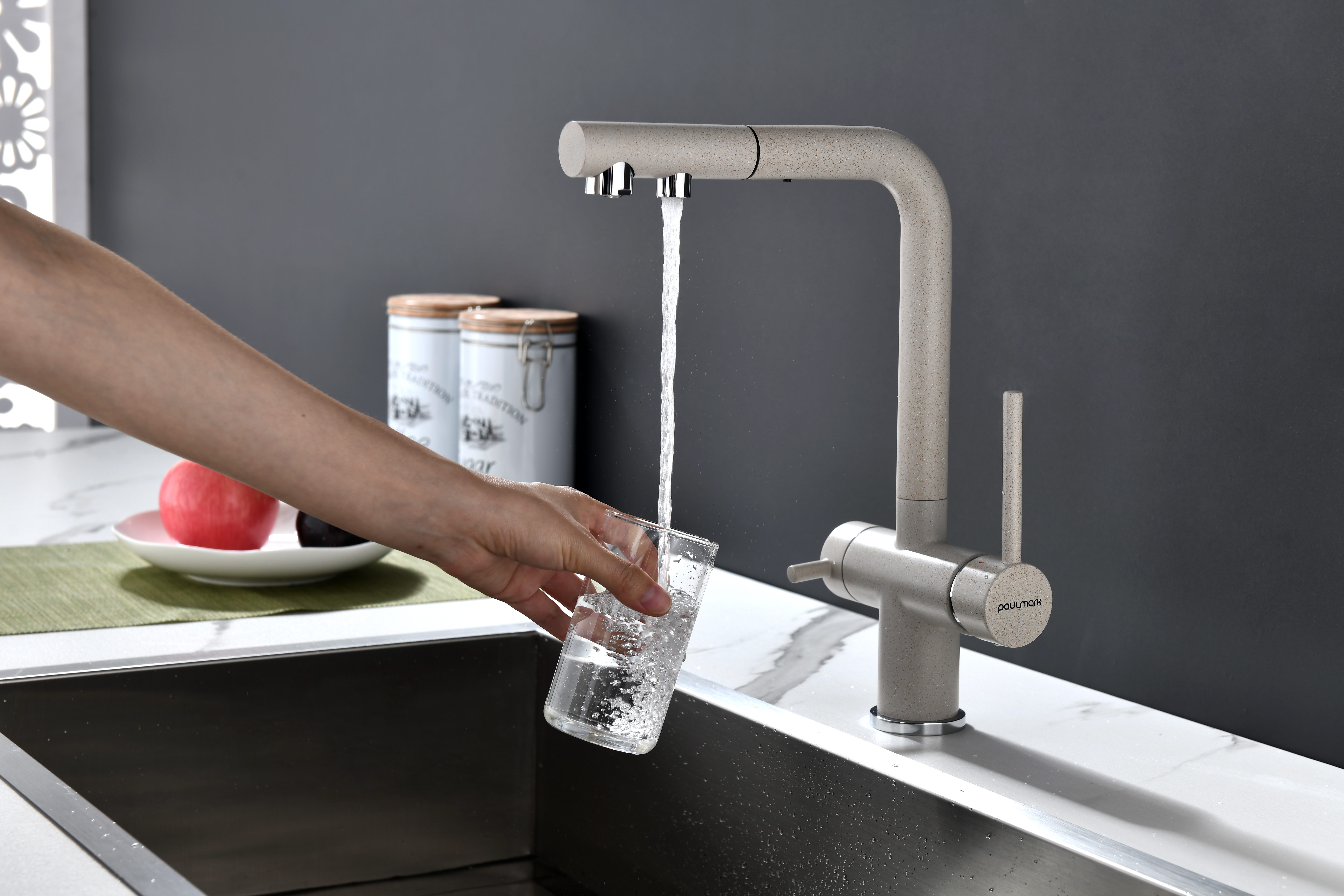SERPENTINE оснащён функцией TRINKWASSER - излив смесителя имеет встроенный независимый канал для питьевой воды из фильтра, таким образом питьевая и водопроводная вода не смешиваются. Управление питьевой водой осуществляется отдельным рычагом, расположенным слева. Для пуска водопроводной воды используется большой рычаг справа.