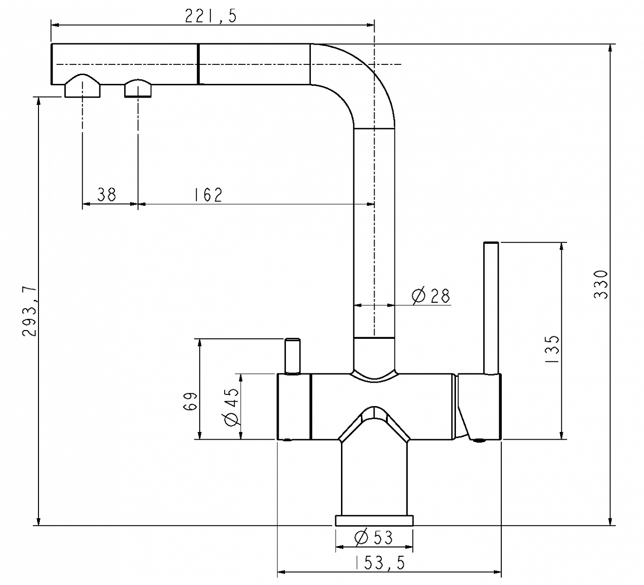 Излив поворотный на 180 градусов. Высота излива – 330 мм.