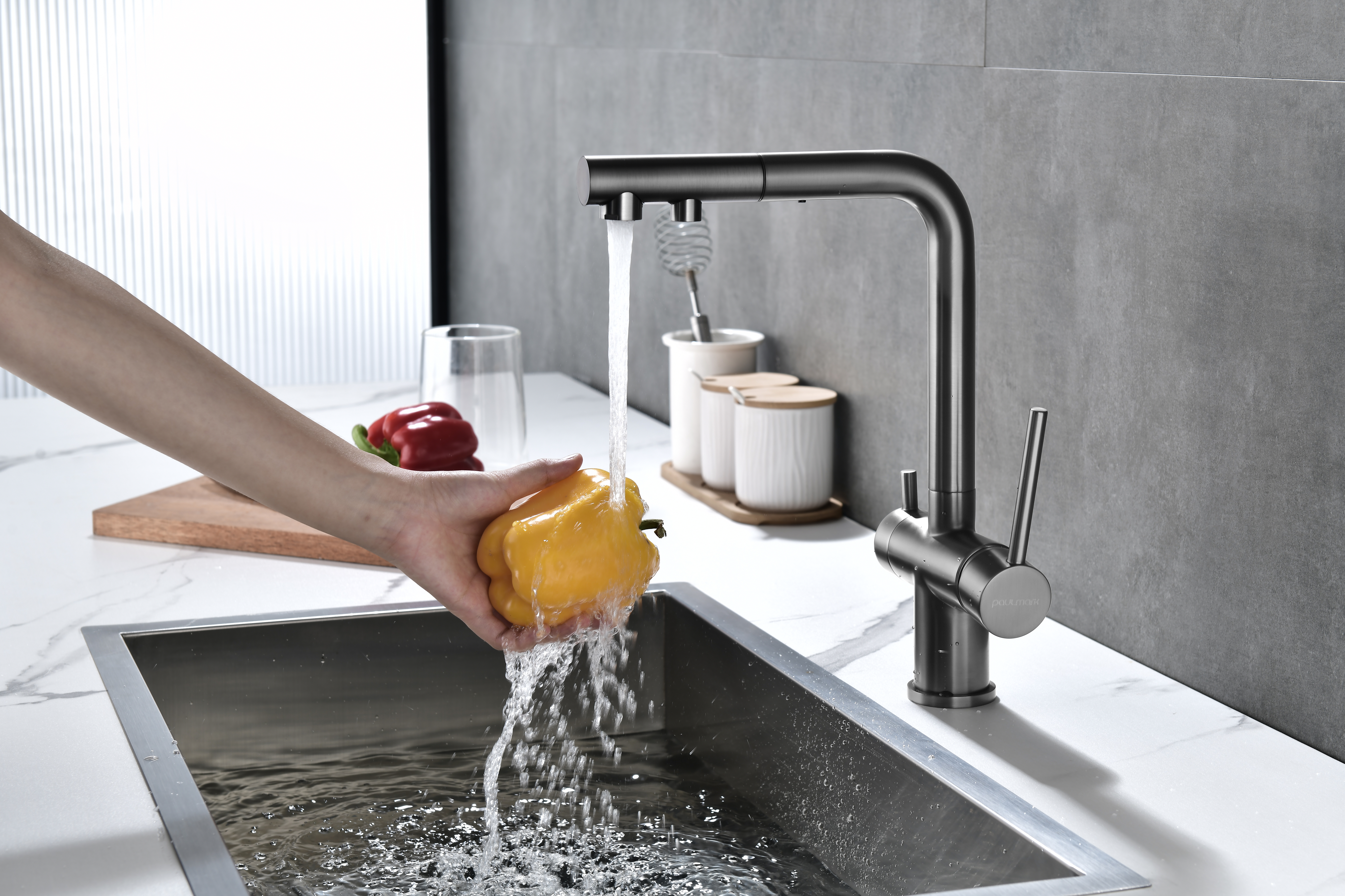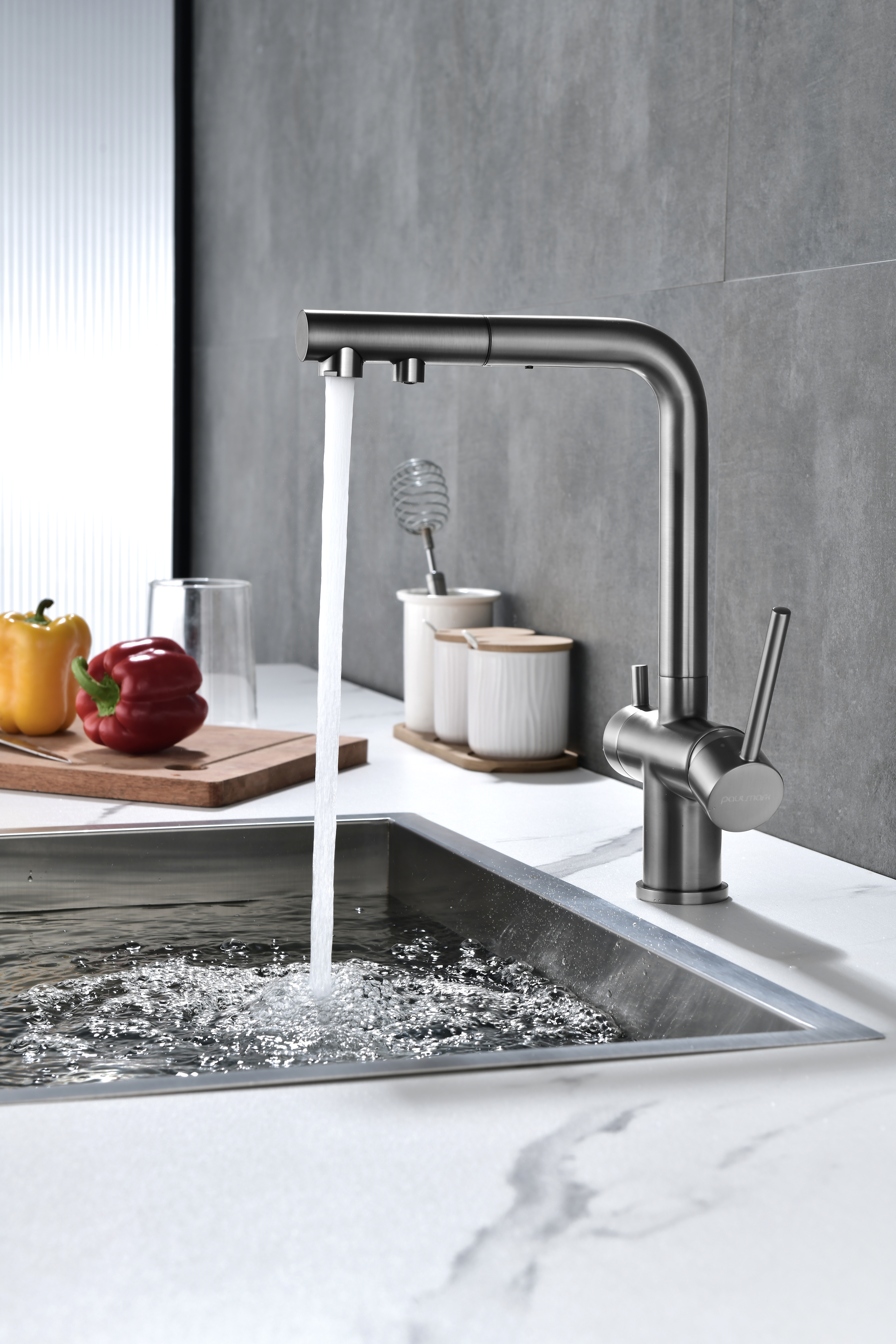 SERPENTINE оснащён функцией TRINKWASSER - излив смесителя имеет встроенный независимый канал для питьевой воды из фильтра, таким образом питьевая и водопроводная вода не смешиваются. Управление питьевой водой осуществляется отдельным рычагом, расположенным слева. Для пуска водопроводной воды используется большой рычаг справа.