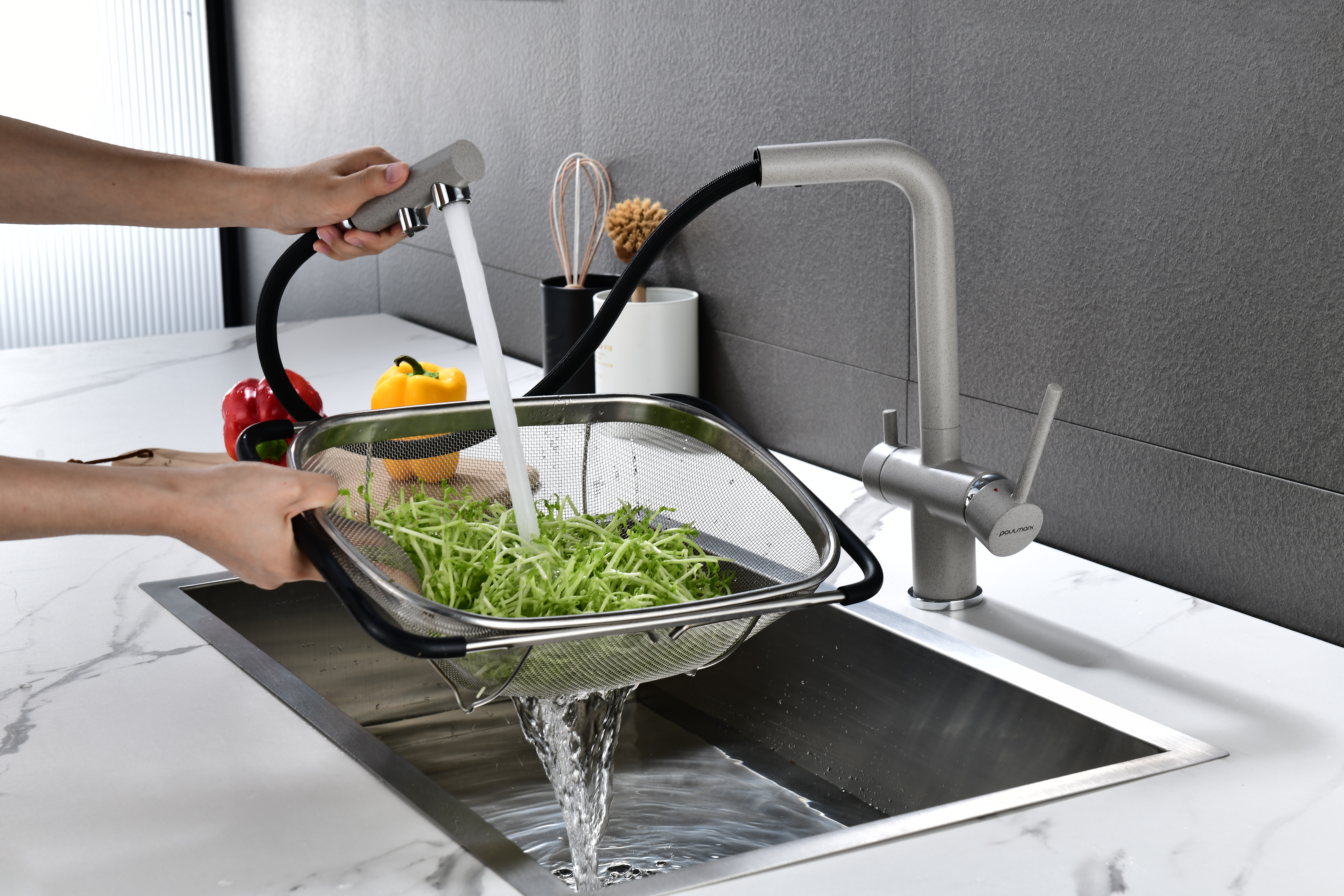 Смеситель оснащен гибким выдвижным изливом из нейлоновой оплетки, которая обладает отличной устойчивостью к истиранию и разрушению. Данная техническая особенность расширяет рабочую зону смесителя, позволяя пользоваться им с удобством в больших мойках, мойках с двумя чашами, или наполнять водой ёмкость на столе рядом с мойкой, в том числе питьевой водой.