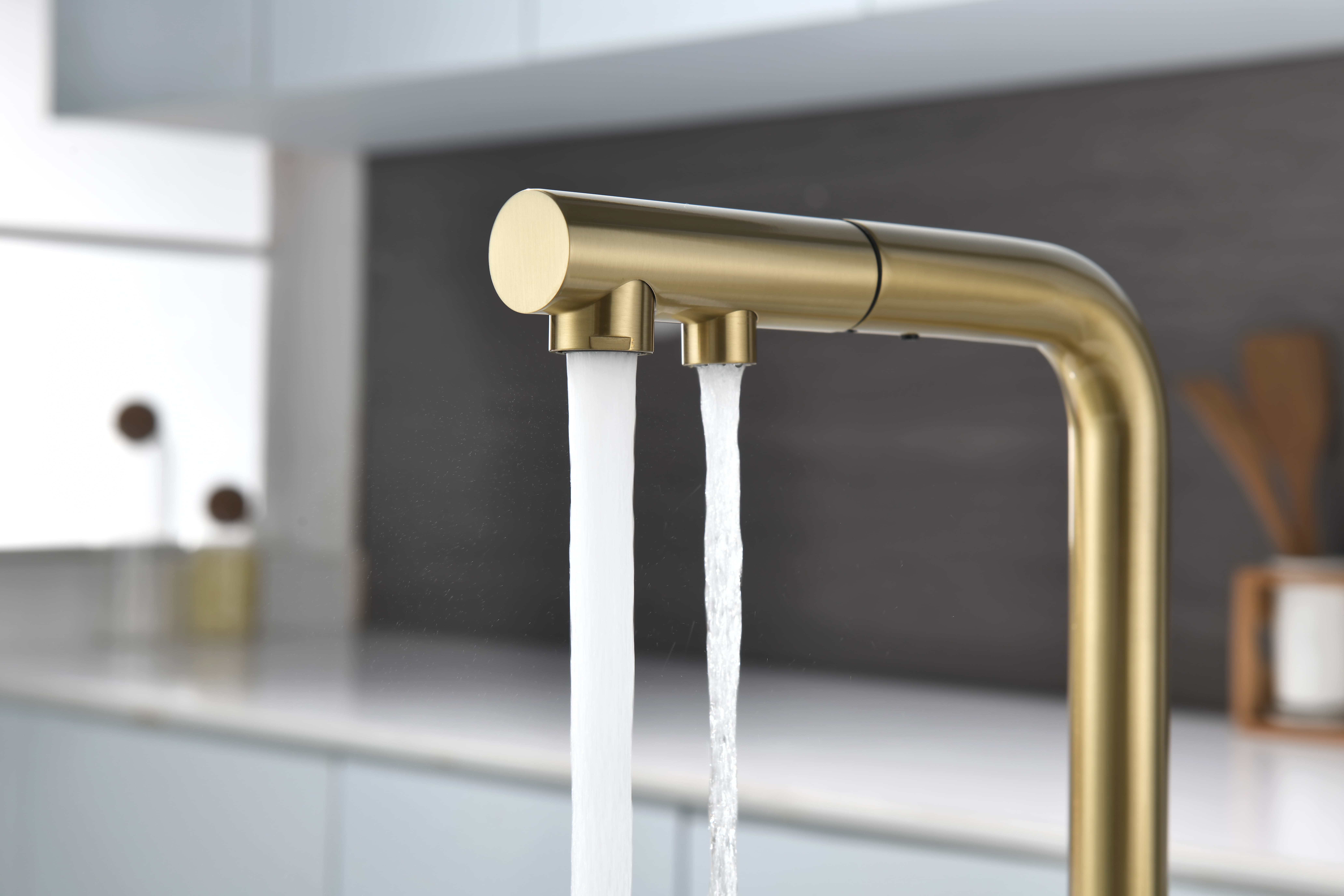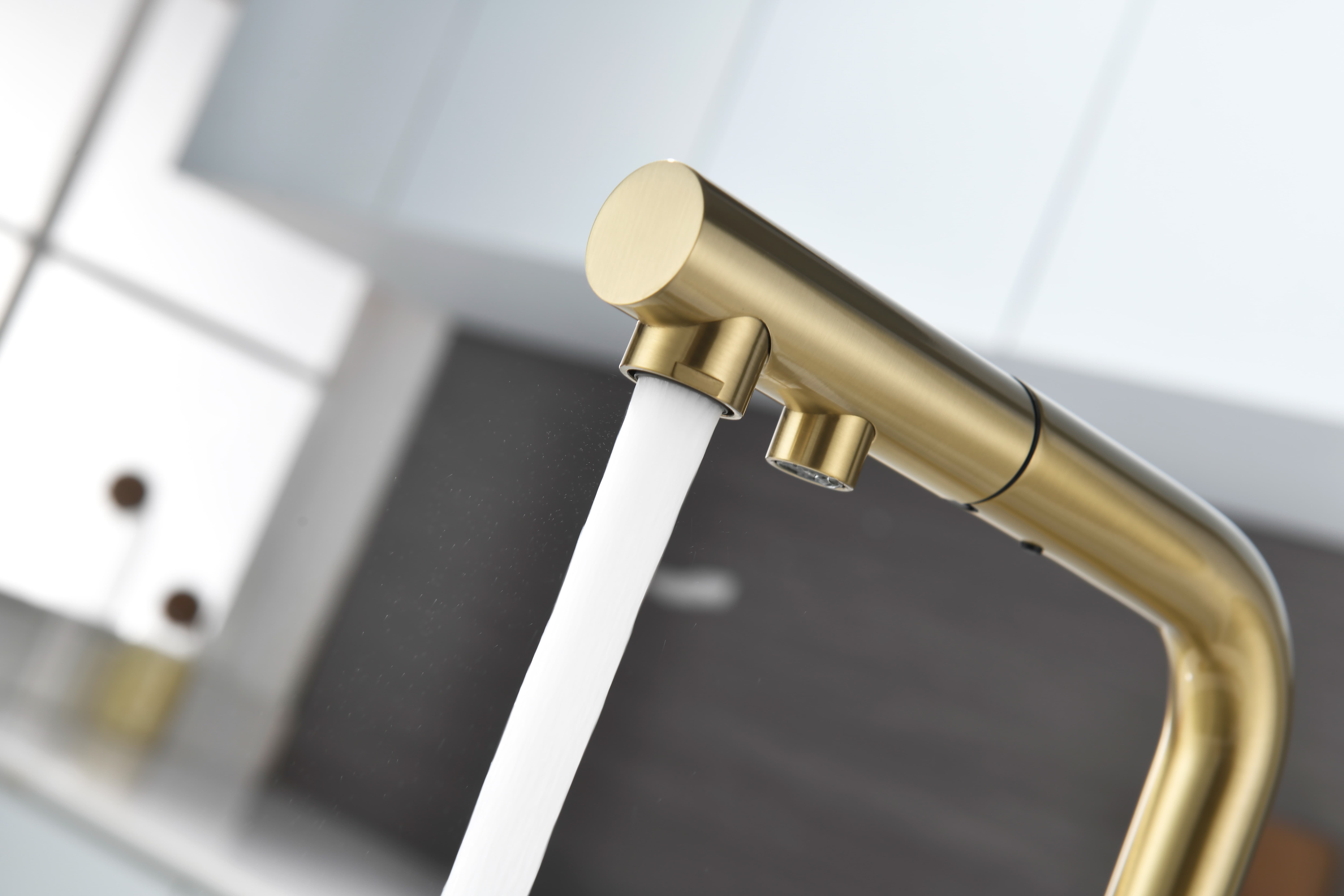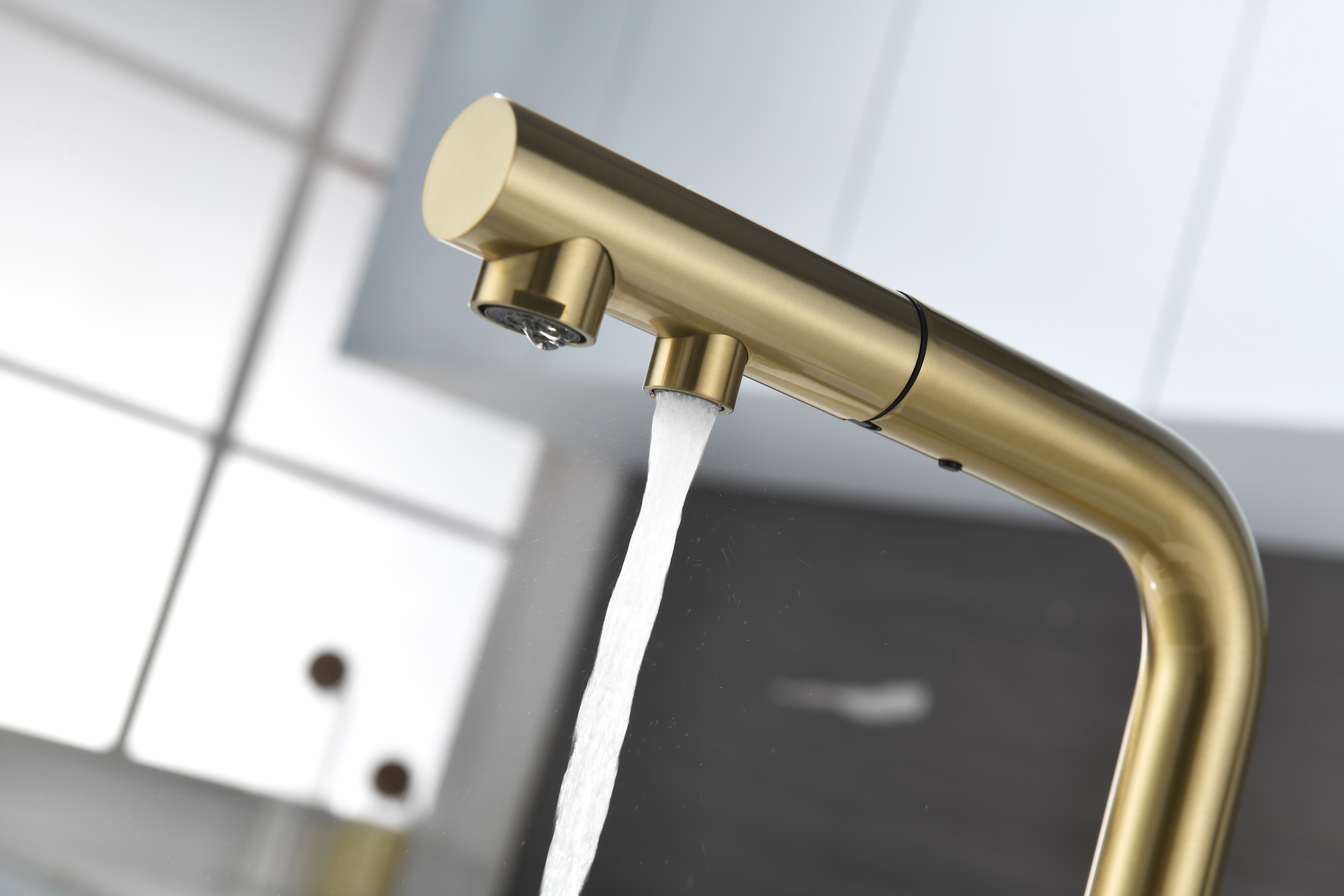 Смеситель оснащен гибким выдвижным изливом из нейлоновой оплетки, которая обладает отличной устойчивостью к истиранию и разрушению. Данная техническая особенность расширяет рабочую зону смесителя, позволяя пользоваться им с удобством в больших мойках, мойках с двумя чашами, или наполнять водой ёмкость на столе рядом с мойкой, в том числе питьевой водой.