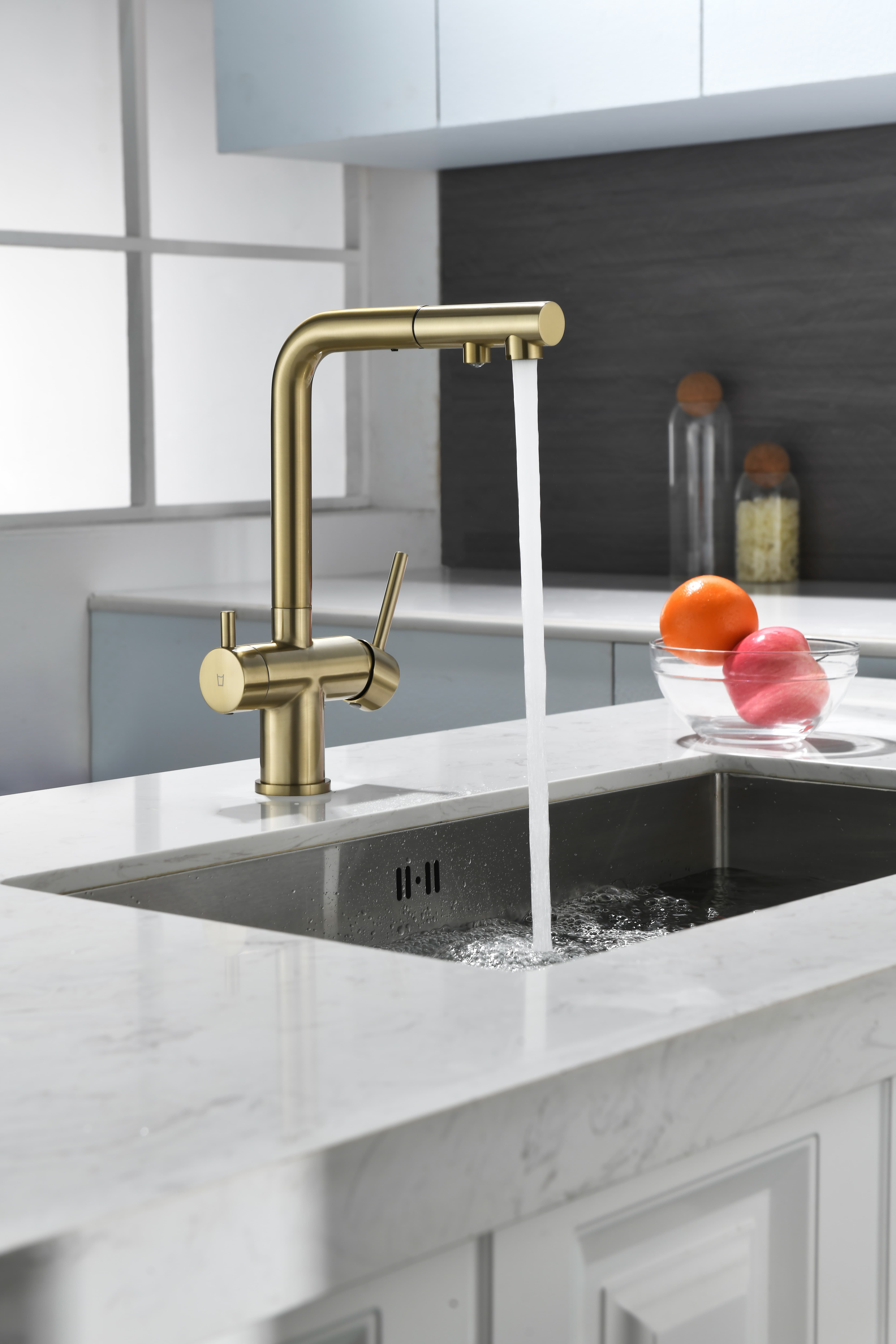 SERPENTINE оснащён функцией TRINKWASSER - излив смесителя имеет встроенный независимый канал для питьевой воды из фильтра, таким образом питьевая и водопроводная вода не смешиваются. Управление питьевой водой осуществляется отдельным рычагом, расположенным слева. Для пуска водопроводной воды используется большой рычаг справа.